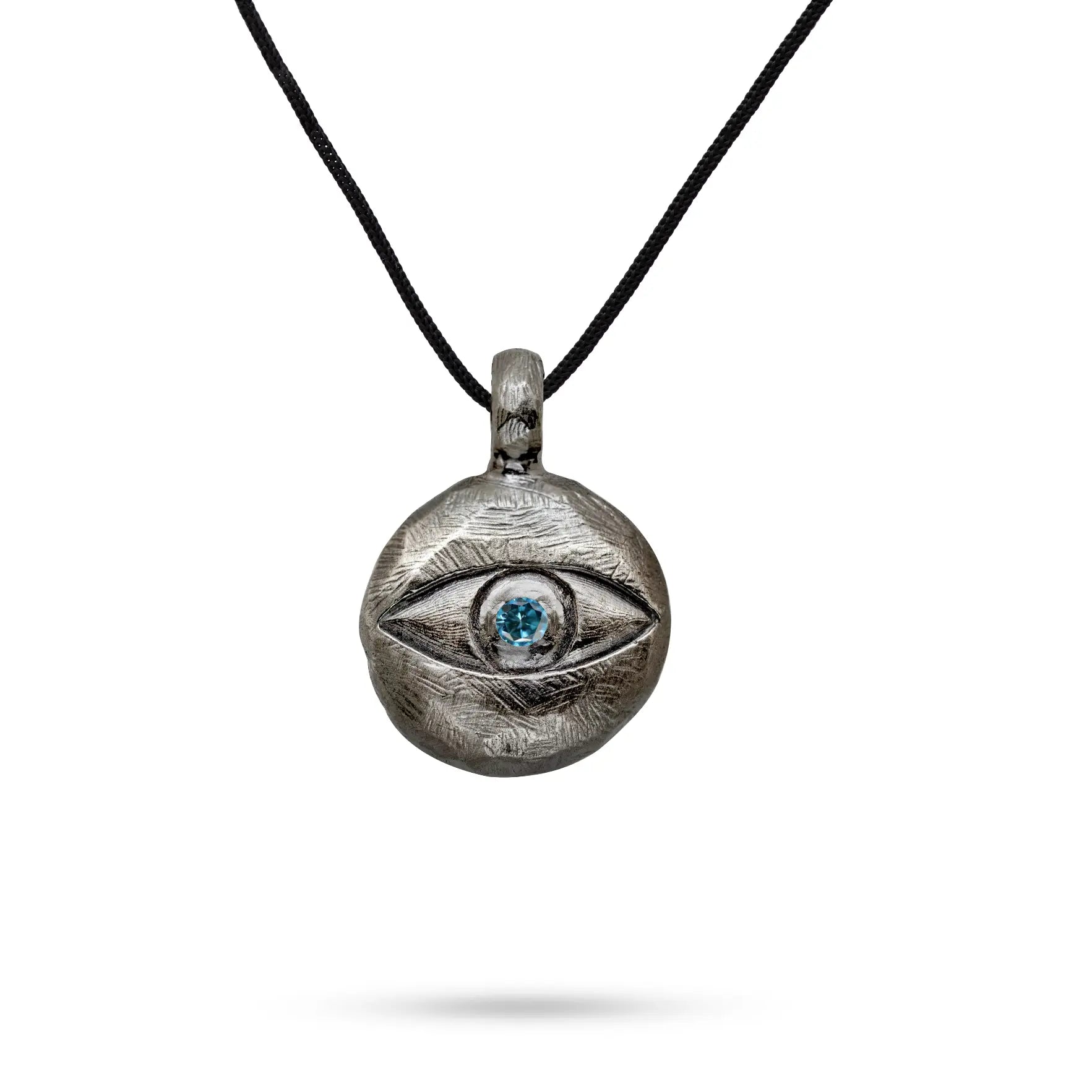 A sterling silver necklace with an evil eye pendant and a blue topaz gemstone for men in oxidized silver. It is 100% made by hand and it is an excellent choice for a gift for him.